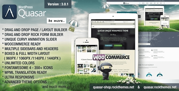 Quasar is a very powerful responsive, retina ready, WPML (localization) ready, WooCommerce ready theme. Quasar comes with Rock Page Builder, Curvy Slider and Rock Form Builder. Enjoy!